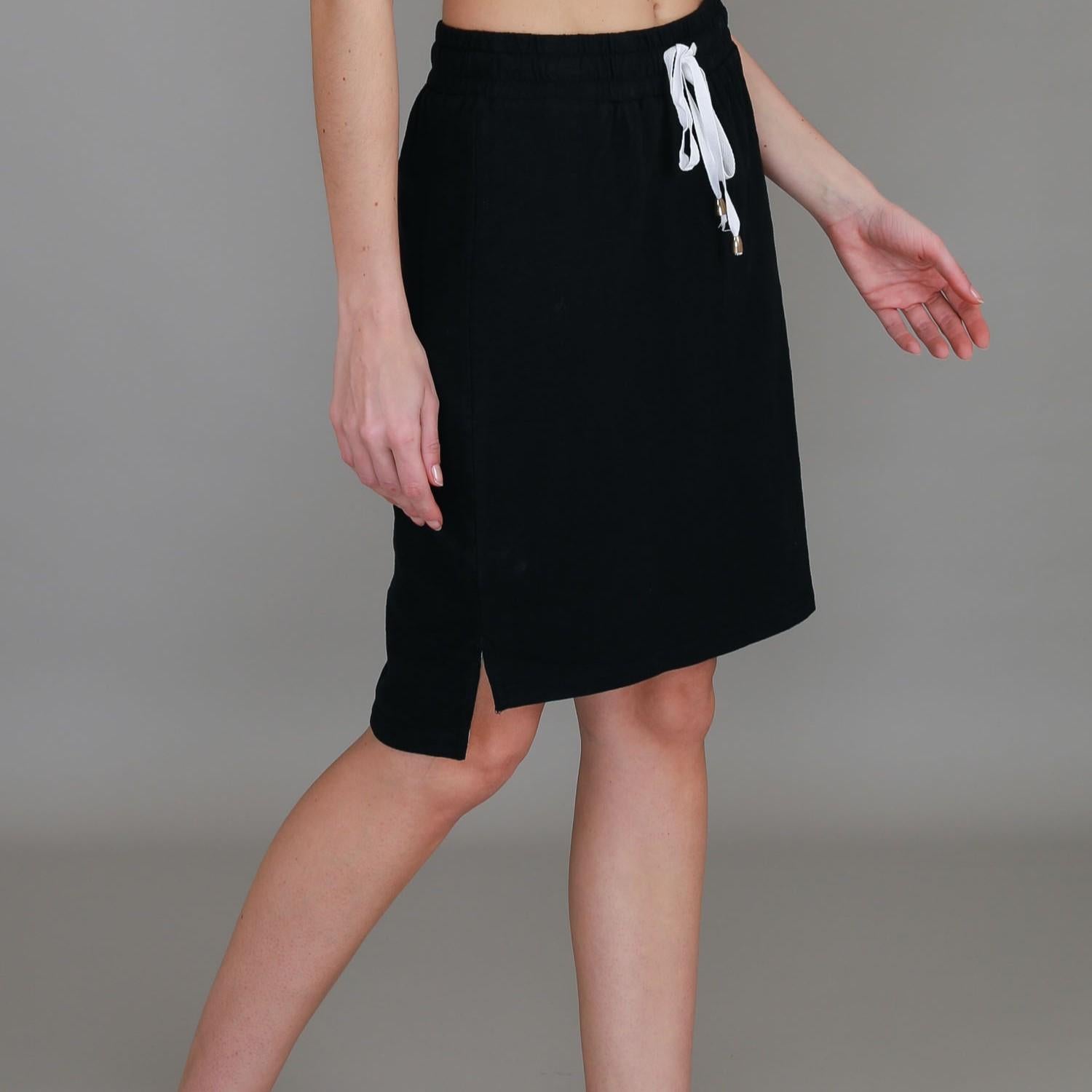 The Alice Skirt is your easy, everyday essential—simple, versatile, and always flattering. This black skirt is designed in a comfortable knee-length cut with a soft elasticated waistband and contrast drawstring for an adjustable fit. The subtle side split adds ease of movement and a casual edge.