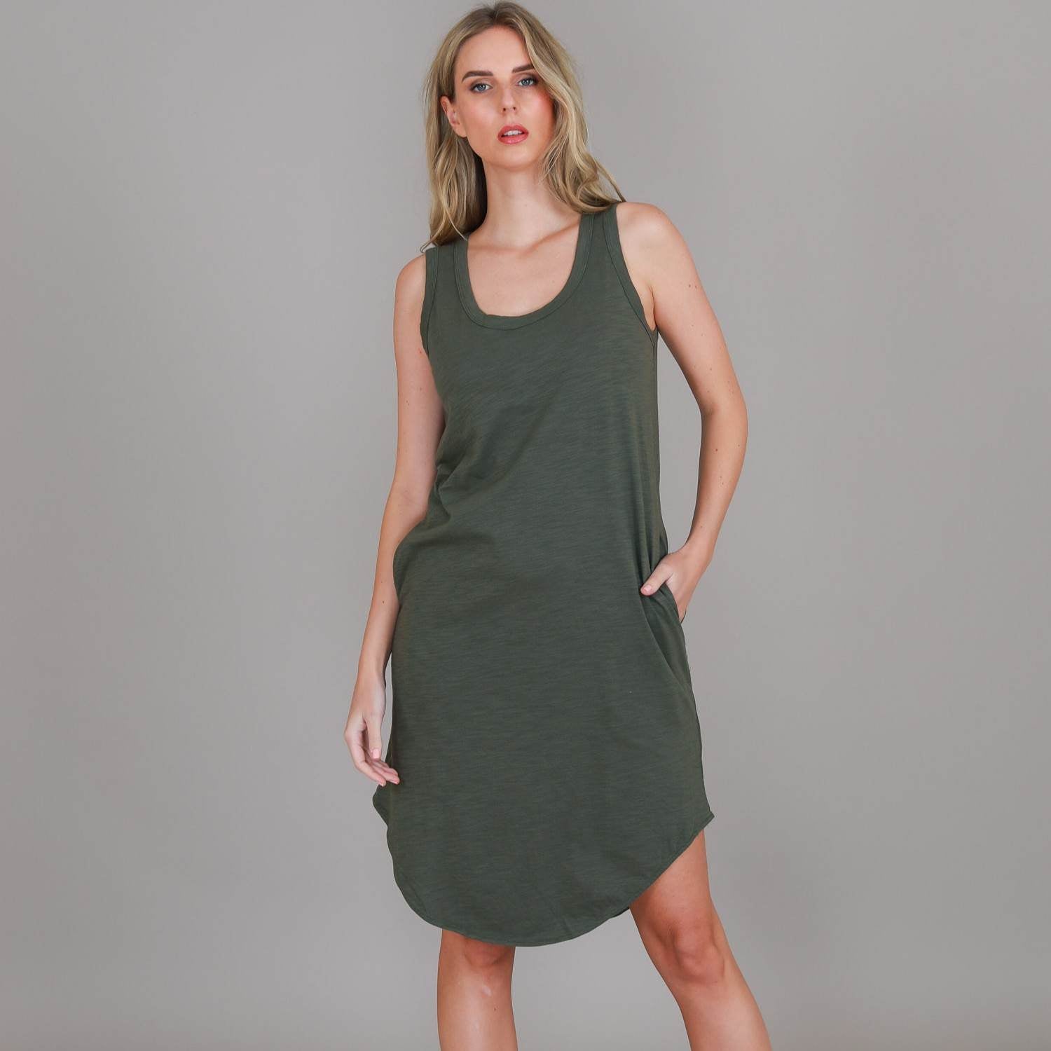 The Bailey Tank Dress is the perfect blend of comfort and casual style. Cut from soft cotton jersey, this sleeveless tank dress features a scoop neckline, relaxed silhouette and curved high-low hem that flatters every shape. The breathable fabric and easy fit make it a go-to choice for warm days, travel and weekend wear.