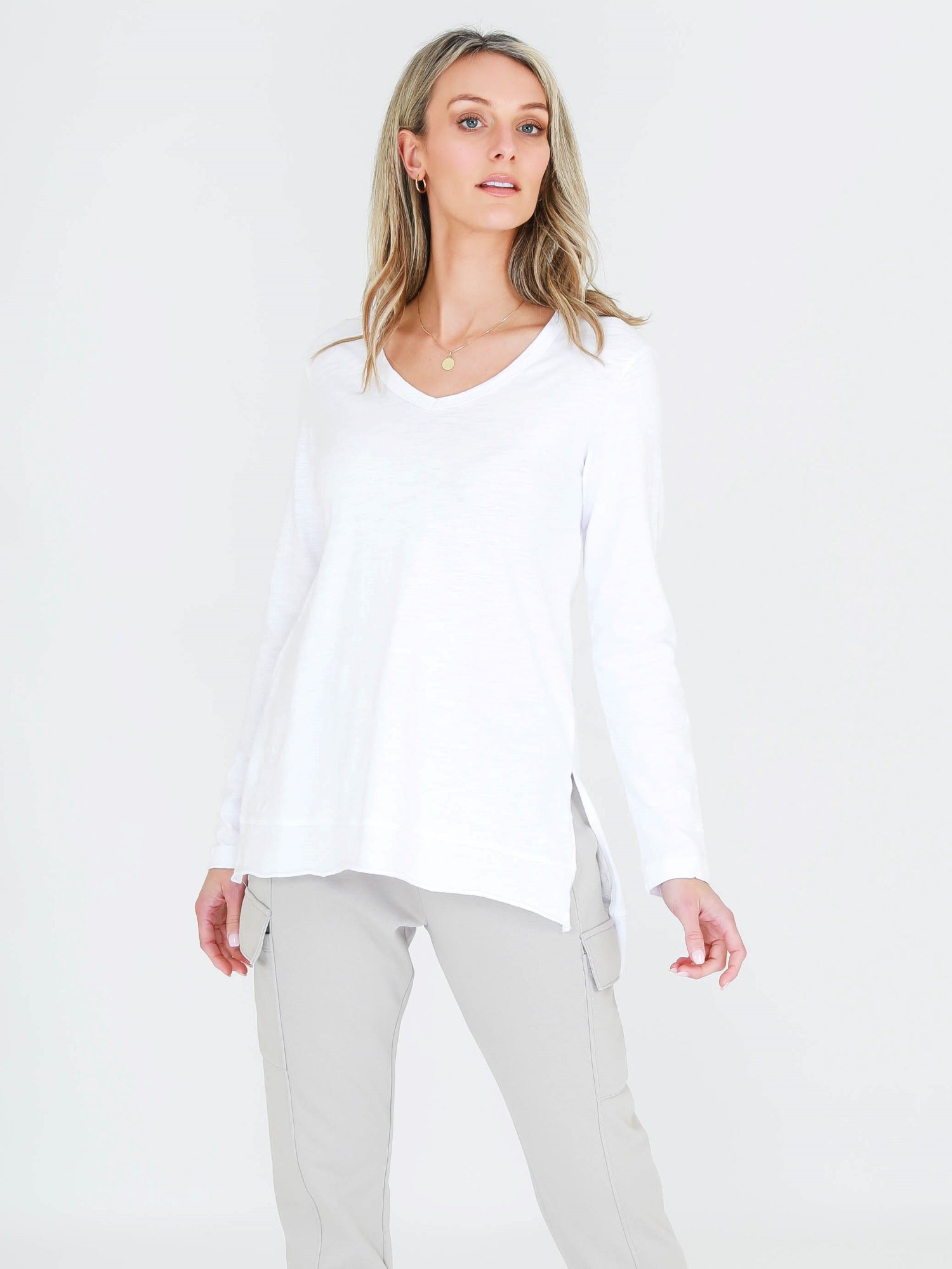 The Barwon T-Shirt is a longline Essential made from soft, breathable cotton jersey for all-day comfort. It features a flattering v-neckline, long sleeves, and a subtle hi-lo hem that creates an easy, relaxed silhouette. A core style from our Essential T-Shirts range, this white long-sleeved top is also part of our White Long Sleeve Tops and V-Neck Tops collections, designed for effortless layering or everyday wear.