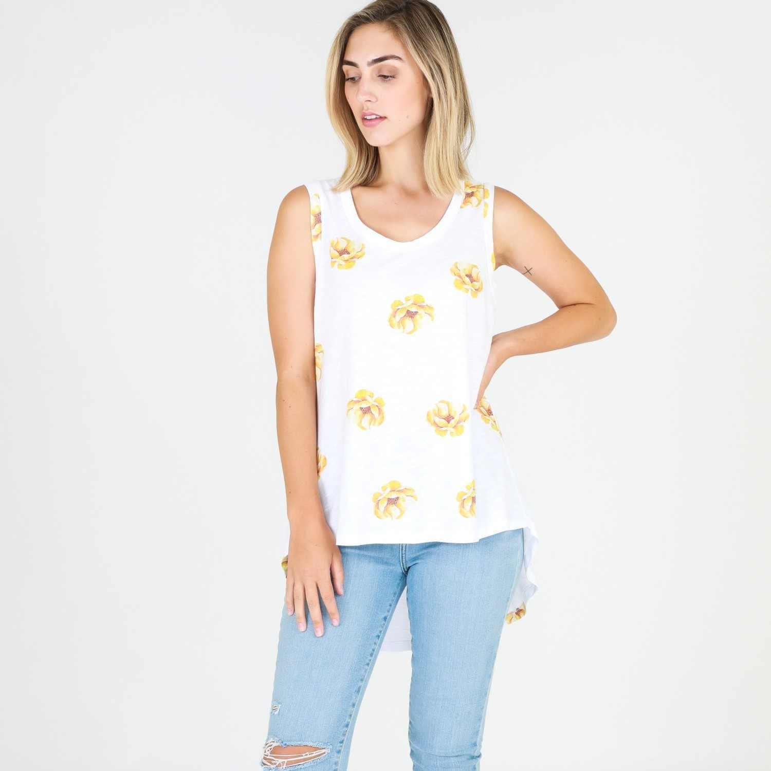 This Camilla tank is made from 100% cotton and features a curved back hem and scoop neckline. It has the perfect and relaxed fit. Featuring a pretty yellow flower print to brighten any day.