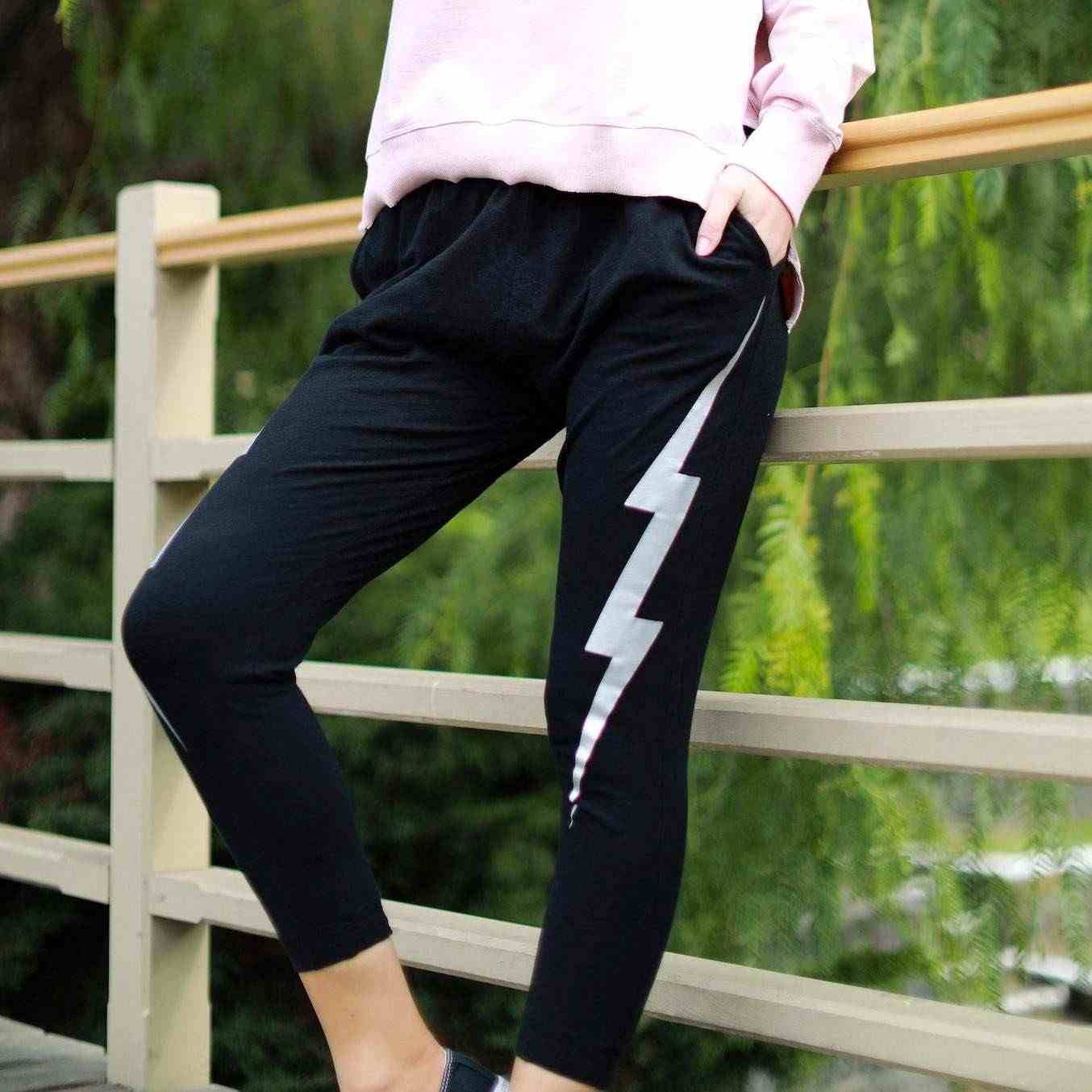 Relax in style with the Daisy Joggers. The elasticated waist and cuffs give these a less slouchy fit than a typical jogger. The jogger is designed with a drop crotch and made in a mid-weight cotton slub for the colder months. Printed across the thigh is a lightning bolt print.