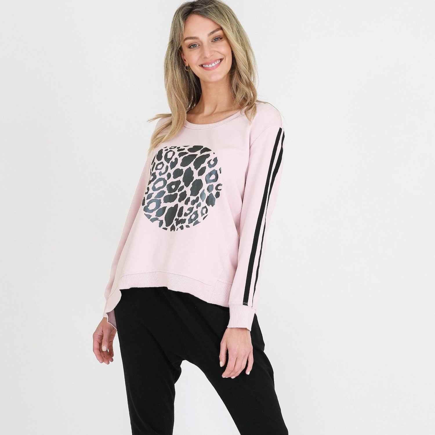 The Faith Sweater is 3rd Story's popular classical oversized sweatshirt, features dropped shoulders and asymmetrical back hem. Offers a relaxed fit with ribbed banding at the crew neck, cuffs and hem. We've finished the front with a leopard sphere print and stripes on the sleeves for a sporty touch. It's the perfect staple to build outfits around.