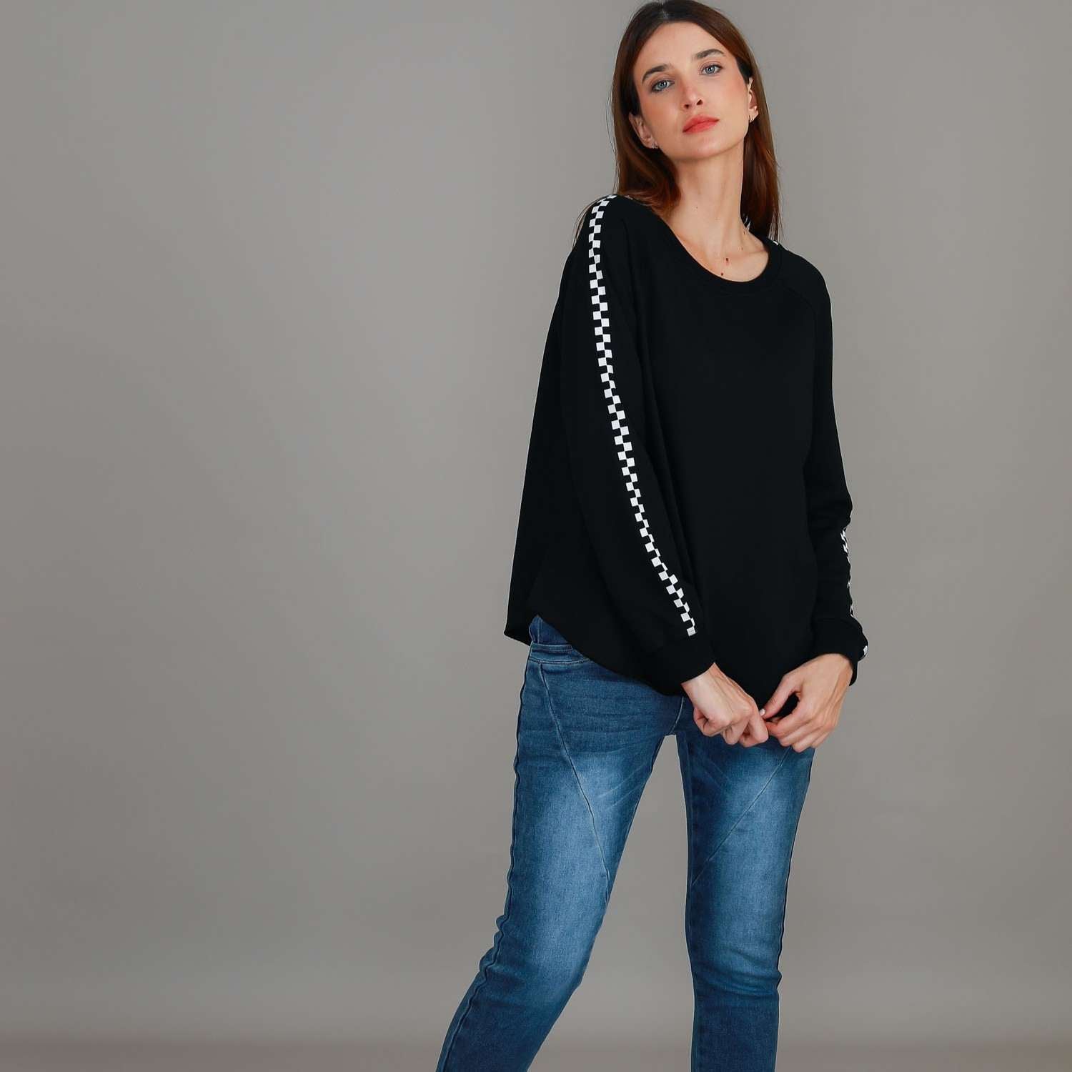 Stay snug in style with our Check Stripe Sweatshirt. Crafted with a premium blend of French terry fabric, this luxurious piece is designed with a relaxed fit, raglan sleeve, crew neck, raw hem, and check stripe along the sleeve. Timeless yet contemporary, this piece will elevate your look with effortless sophistication. Pair with one of 3rd Story's popular joggers.