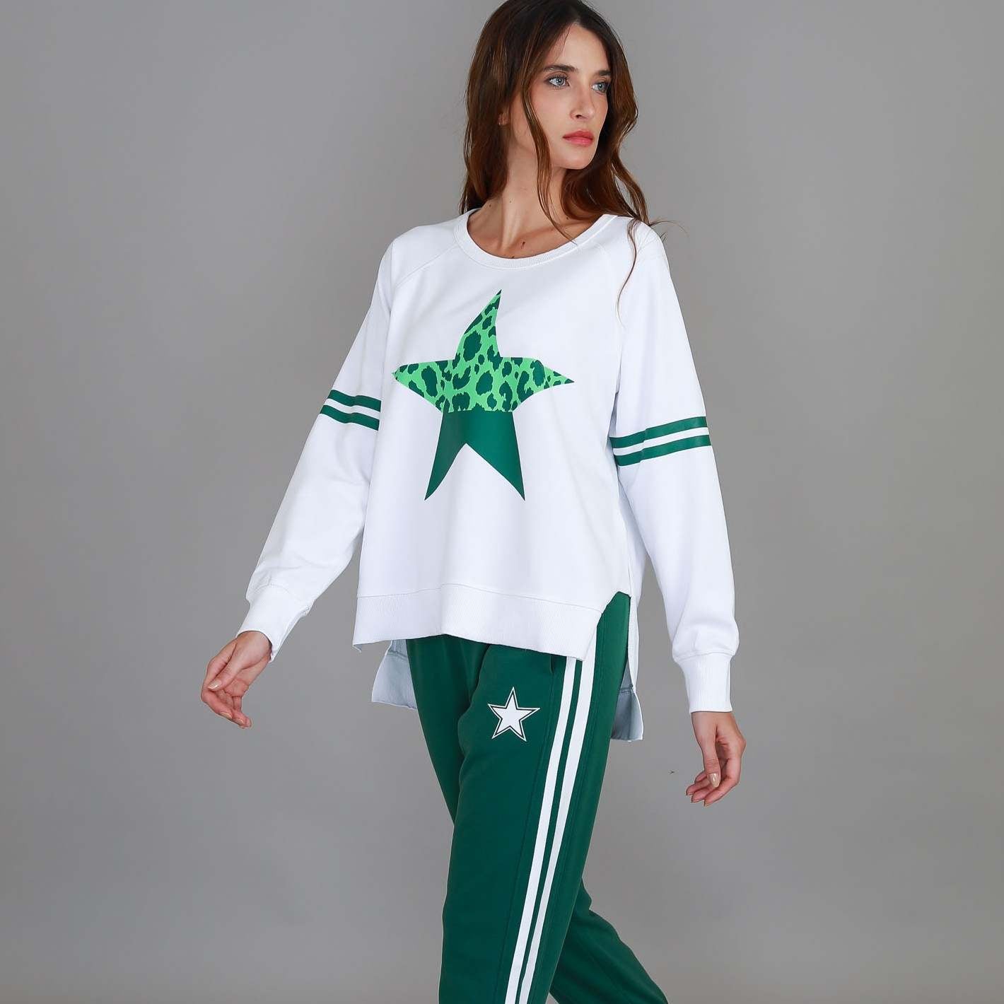 The Ginger Leopard Green Splice Star Sweatshirt is a bold update to a classic silhouette. Made from soft French Terry cotton, it features a relaxed fit with ribbed cuffs and an asymmetrical hem for all-day comfort. The standout design includes a large green star with leopard splice detailing and double sleeve stripes, adding a sporty yet stylish edge.