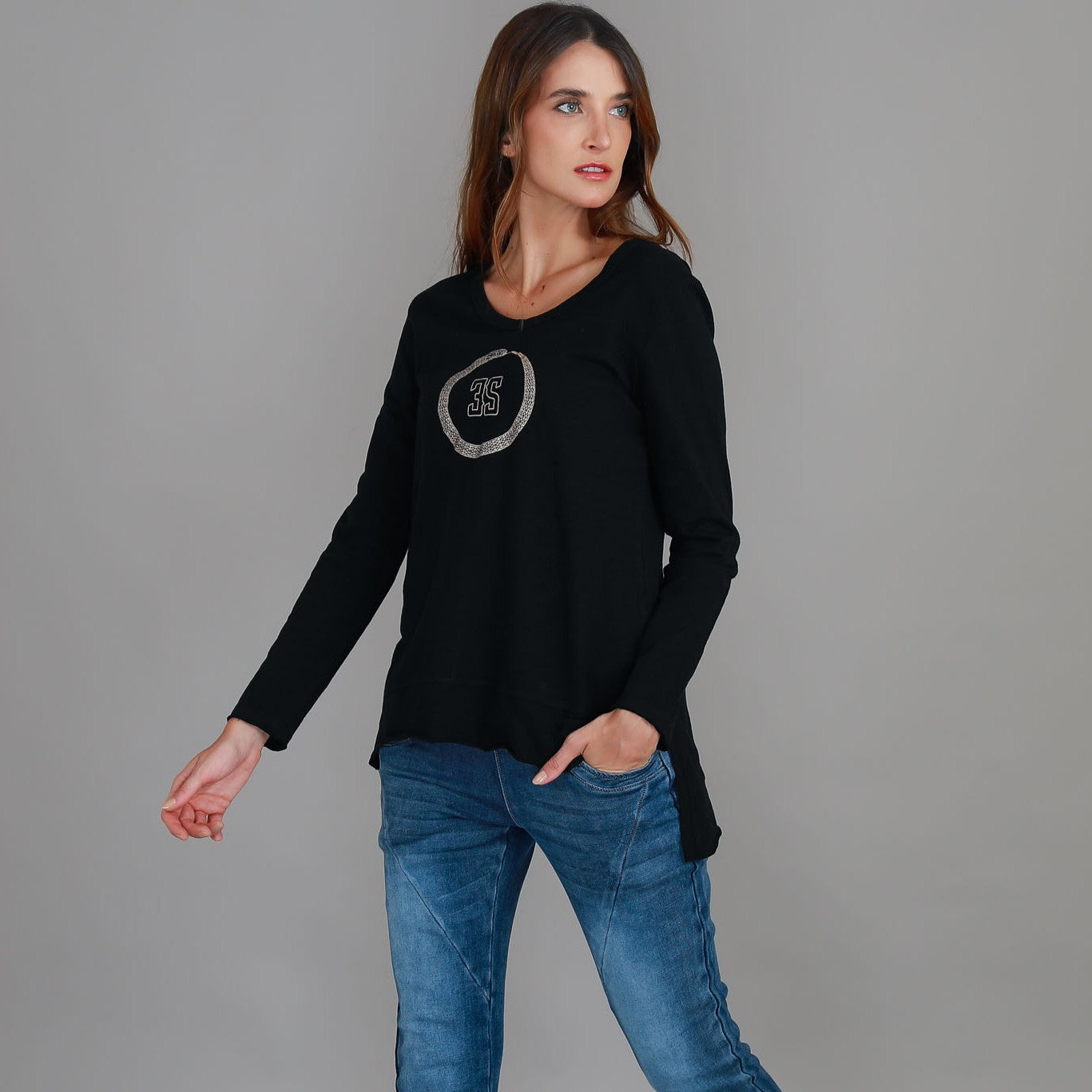 The Ginny 3S T Shirt is a modern essential with a graphic twist. Cut from soft cotton jersey, this long sleeve tee features a relaxed silhouette with side-split hems for ease of movement and layering. The standout detail is the 3S emblem framed by a subtle snake-inspired circle graphic, giving it a sleek edge that elevates a classic black top.