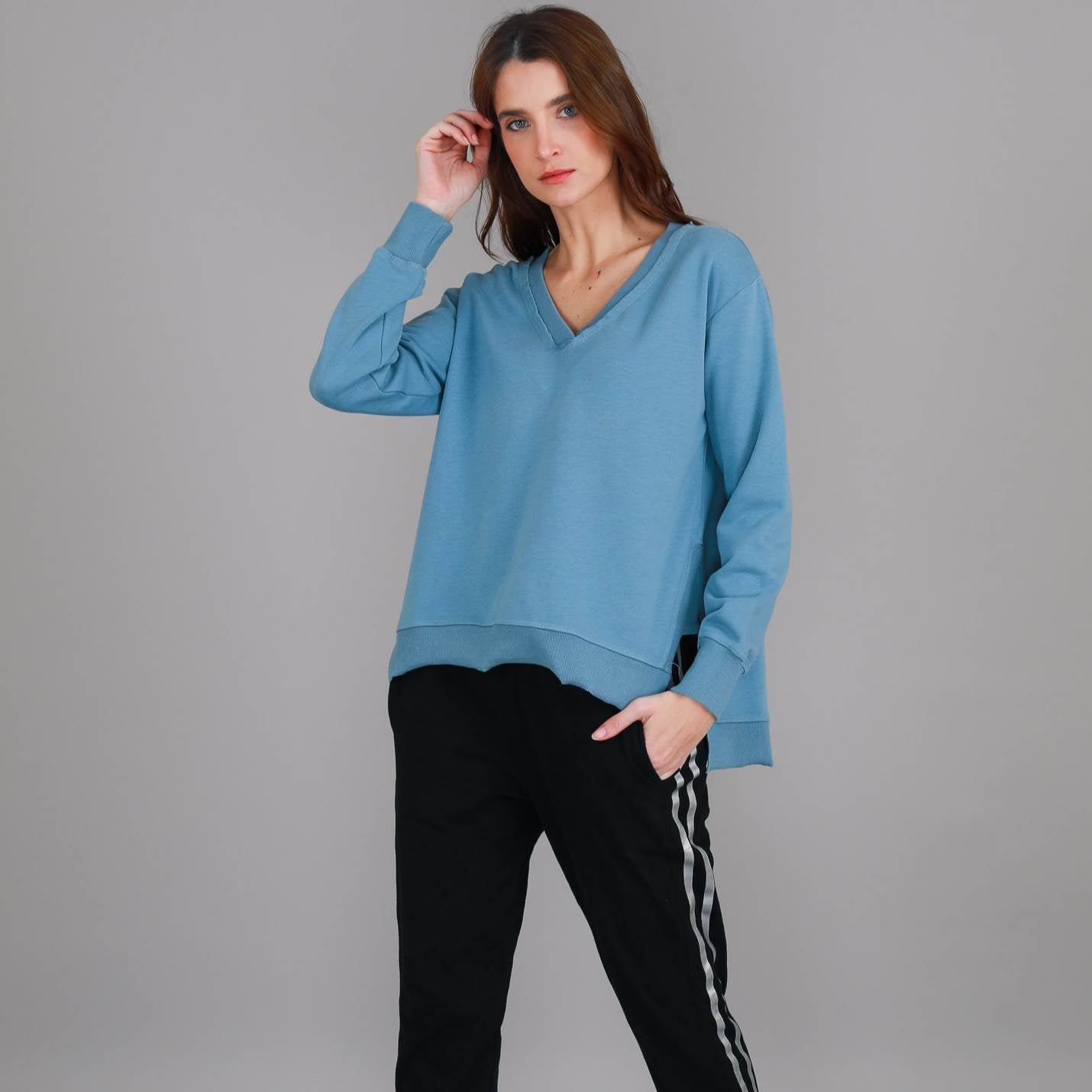 We update wardrobe staples with modern details this season, just like this sweatshirt. Based on the infamous Ulverstone Sweater, the Harmony sweater is made from loopback cotton, it has a V-neck silhouette with raw edge hem and side slits giving it a relaxed shape.