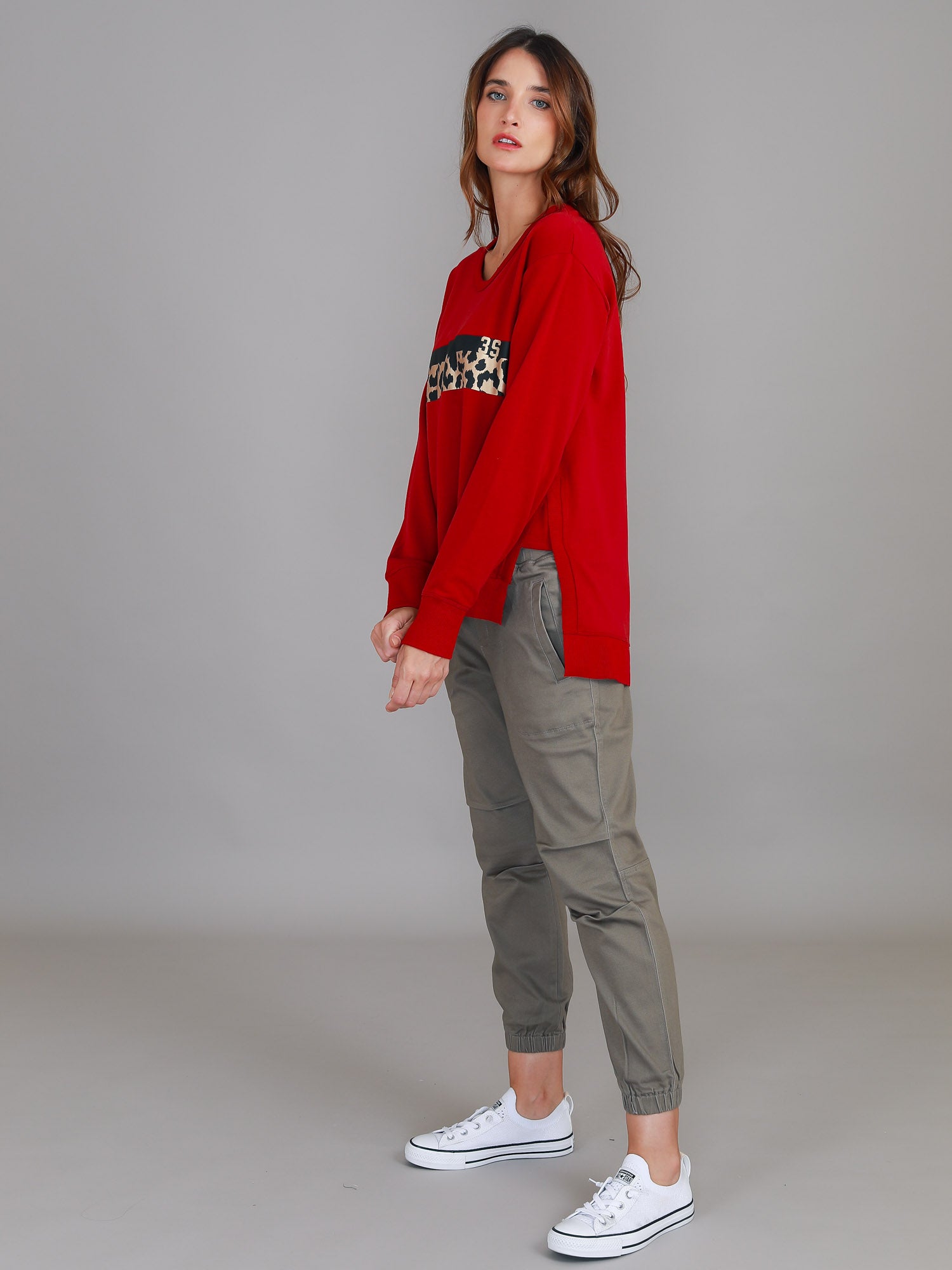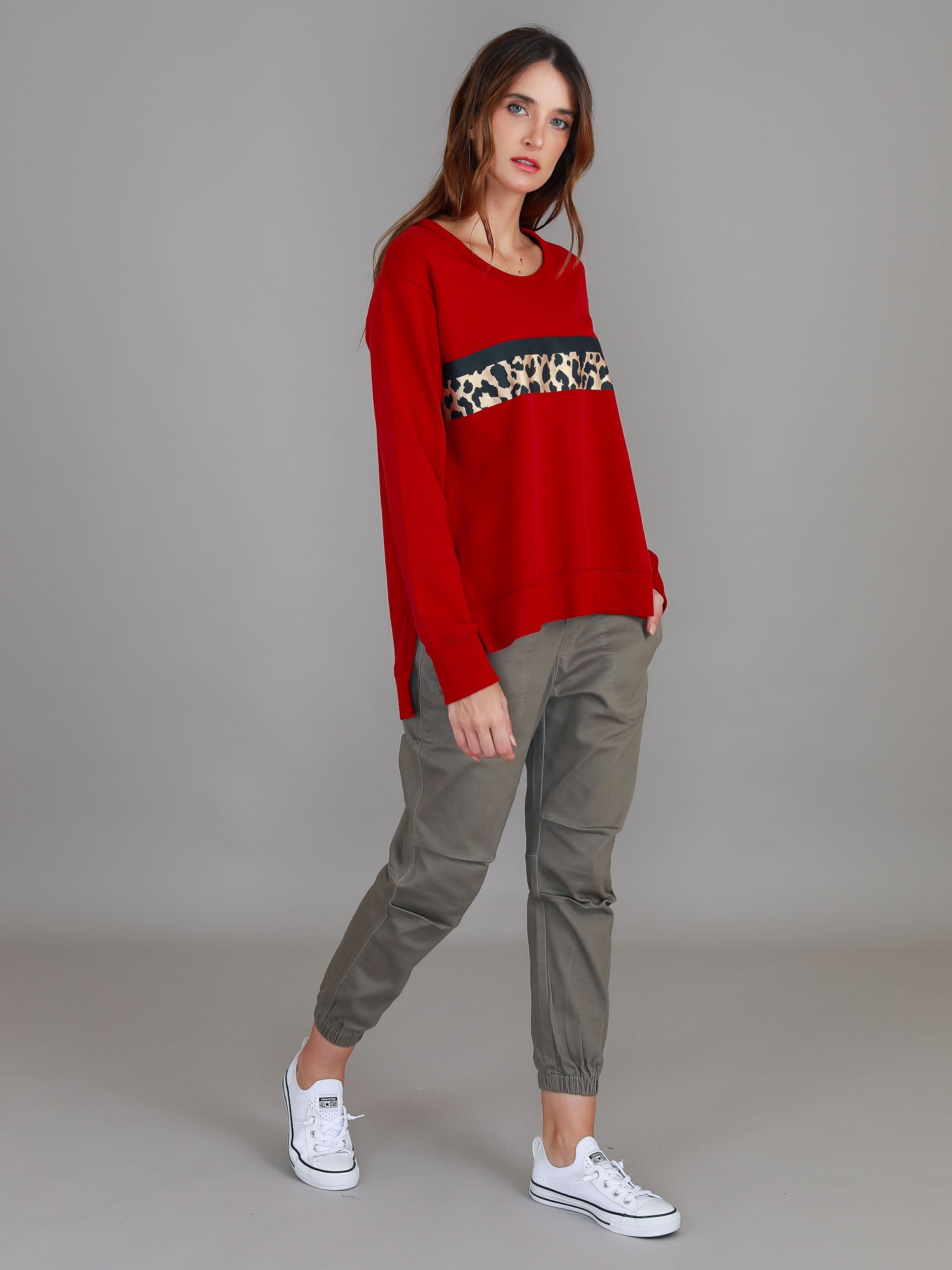 Stay stylish and comfortable with our Harvie Leopard Band Sweatshirt. Made with French Terry and featuring a leopard print on the front, this sweatshirt is perfect for any casual occasion. Its relaxed fit and hi lo side split add a modern touch to your wardrobe. Upgrade your look with ease.