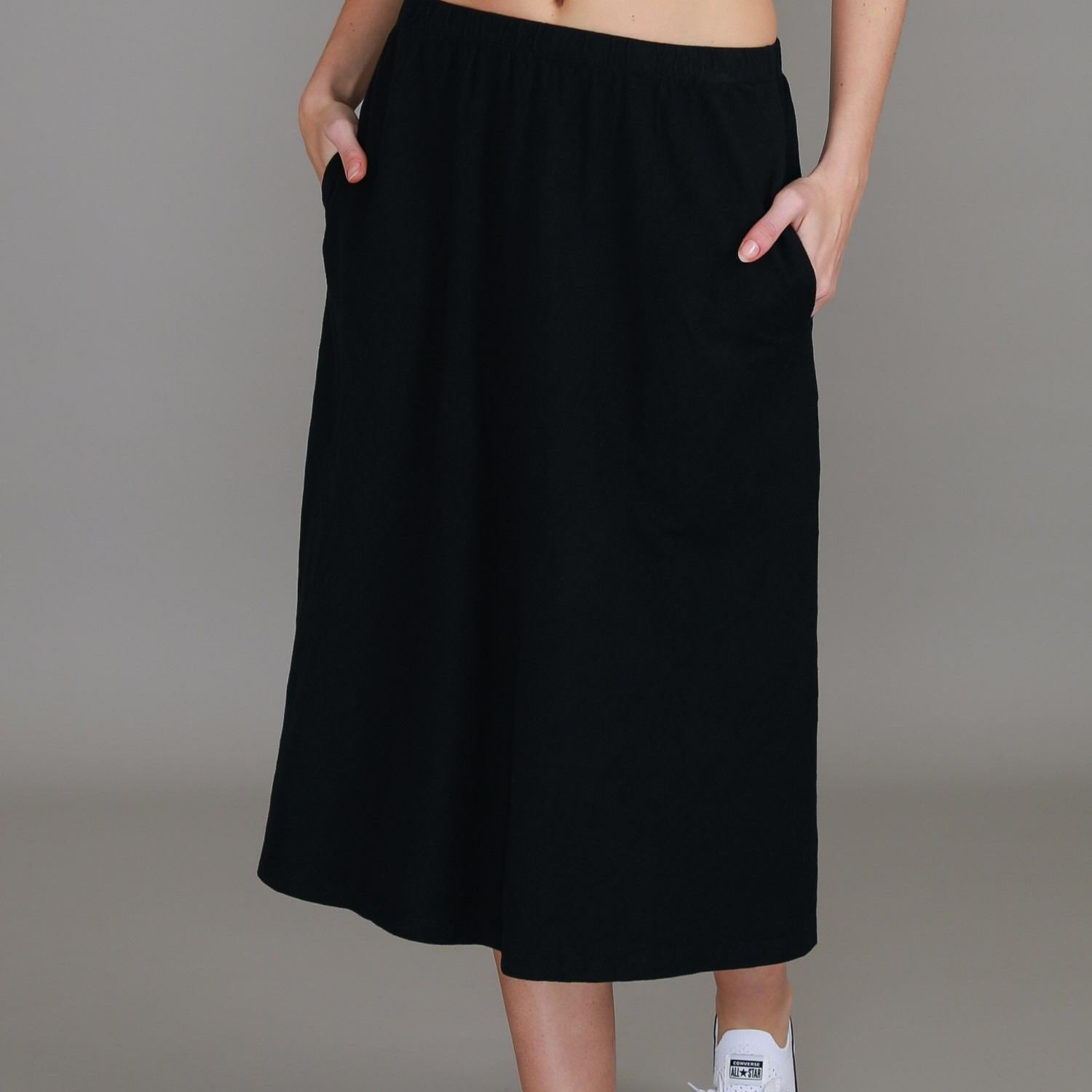 The Heathmont Skirt is a versatile A-line skirt designed for comfort and effortless style. Crafted from soft cotton jersey, it features an elastic waistband for a perfect fit and a wide hemline for added movement. Cut on the bias for a naturally flattering drape, this midi-length skirt is ideal for casual days, travel, or work-to-weekend dressing.