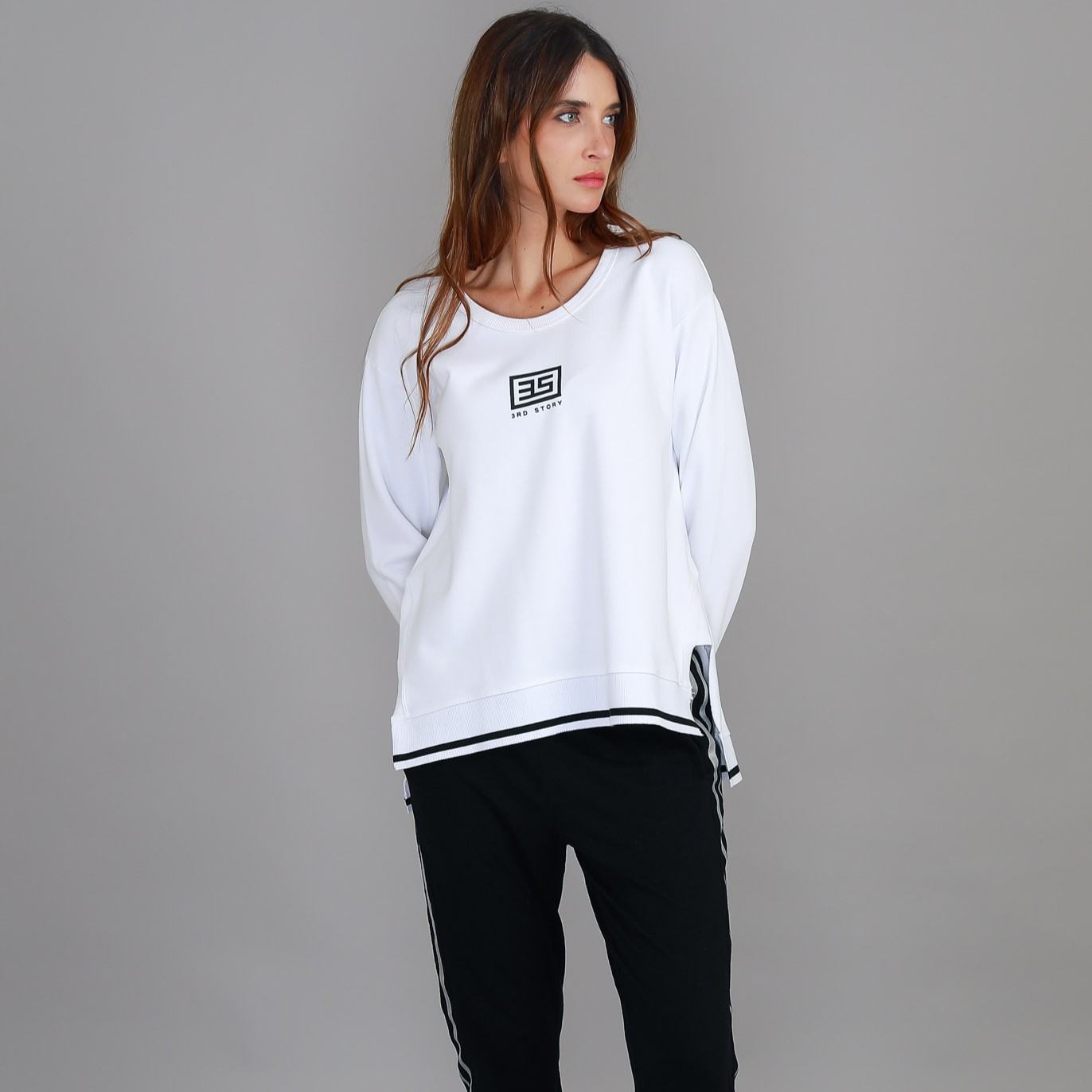 The Lanna 3S Logo Sweatshirt delivers a clean, sporty aesthetic with a modern edge. Made from soft cotton French Terry, this white sweatshirt features a bold 3rd Story logo at the chest and contrast striped cuffs and hem. Its relaxed silhouette and side splits make it an easy layering piece that balances comfort and style.