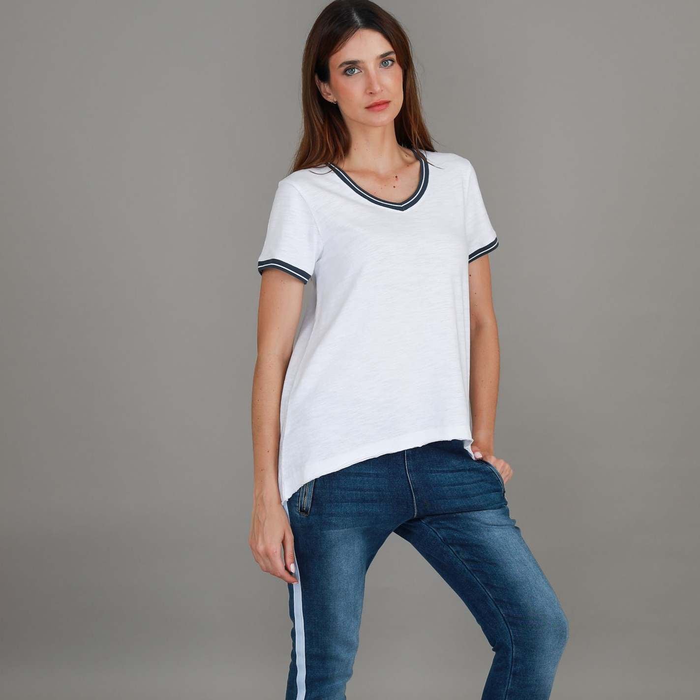 The Mariella Contrast Sleeve V Neck T-Shirt adds a sporty-chic twist to your everyday basics. Made from breathable slub jersey cotton, this flattering v neck tshirt features contrast detail on the neckline and sleeves for a modern pop of style. The relaxed fit and asymmetrical back hem give it a laid-back yet polished finish, perfect for all-day comfort.