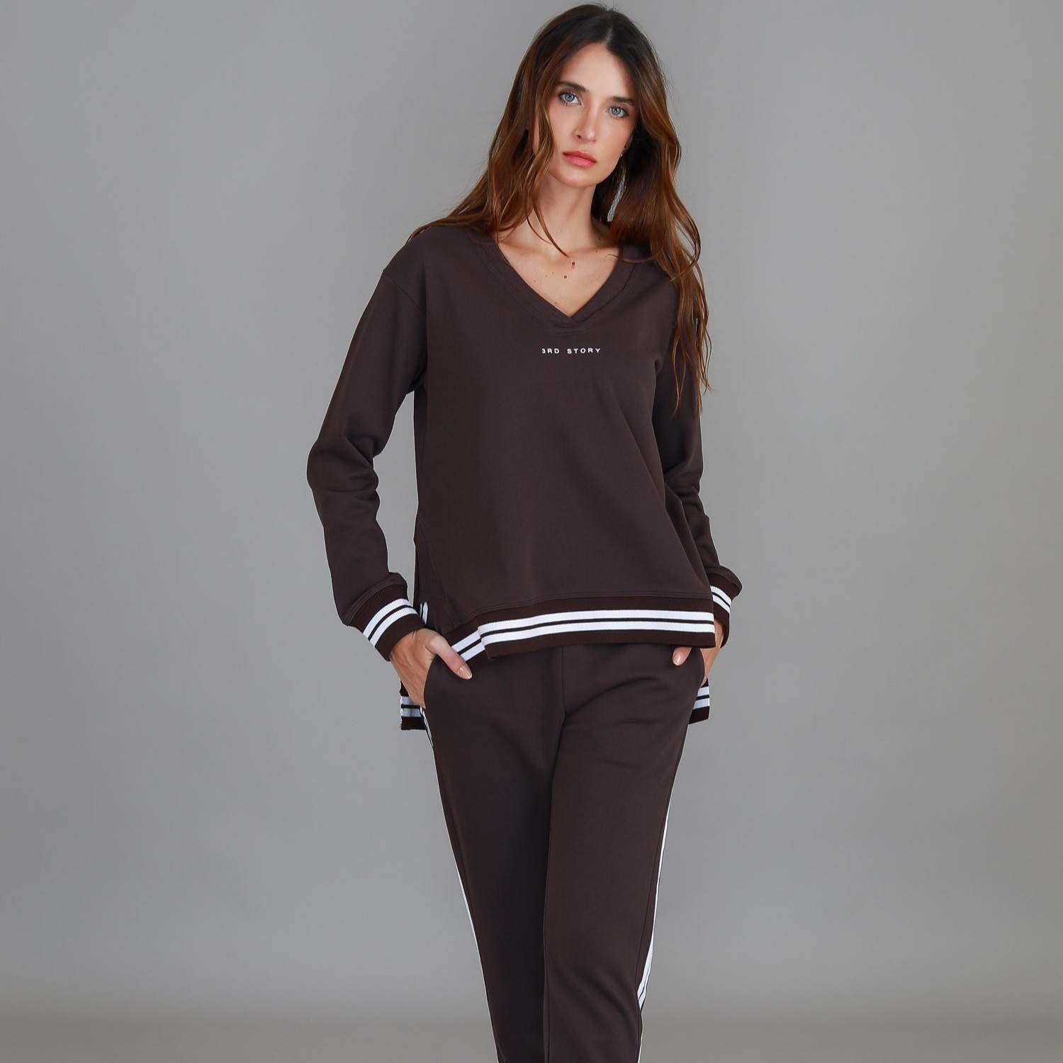 This relaxed-fit Pammy V-Neck Stripe Sweatshirt in Truffle is crafted from soft, breathable French Terry cotton, offering comfort with a polished edge. It features a flattering v neckline, ribbed cuffs and hem with bold white contrast stripes, and subtle side splits for ease of movement. A minimalist 3rd Story logo is printed on the chest, adding a signature detail.