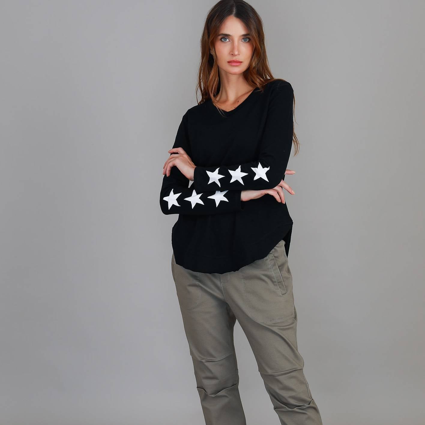 The Rita black long sleeve top brings playful attitude to a classic wardrobe essential. Made from soft cotton jersey, this relaxed-fit top features crisp white star prints running down the sleeves for a bold contrast. A curved high-low hem adds shape and movement, making it easy to wear untucked or layered under outerwear.