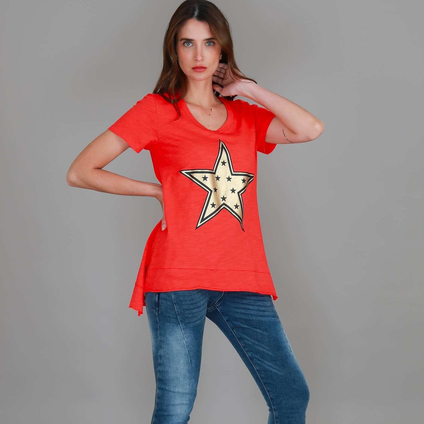 Elevate your style with our Gold Star T Shirt. Crafted with attention to detail, this black t-shirt features a stunning gold star print that adds a touch of glamour to any outfit. The short sleeves and crewneck design offer comfort and versatility, making it perfect for everyday wear or special occasions. With its hi lo hemline and oversized fit, this t-shirt effortlessly combines fashion and comfort. Make a statement with our Gold Star T Shirt and shine like a star wherever you go.