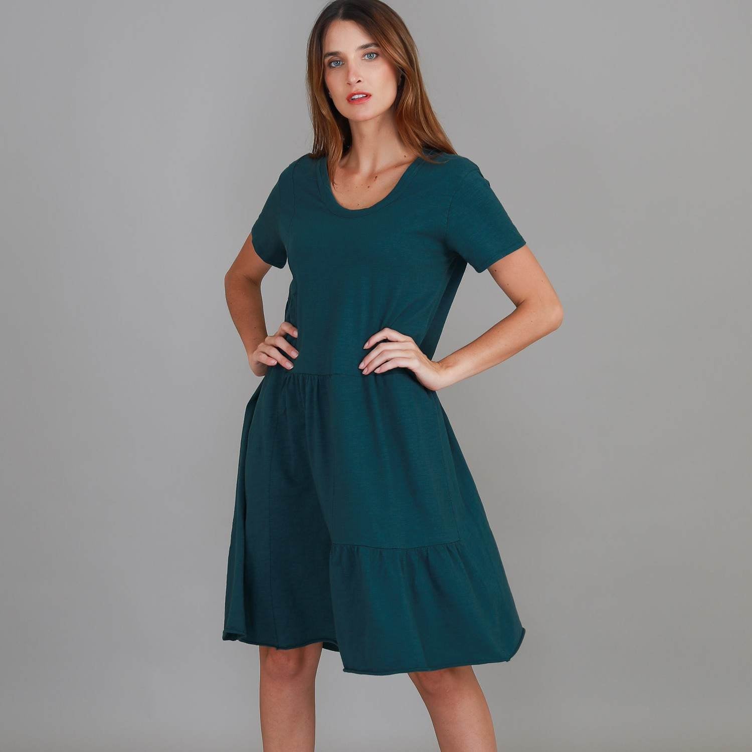 The Ruby Short Sleeve Dress is your go-to for effortless style and all-day comfort. Made from 100% cotton, it features a soft, breathable feel and an easy, relaxed fit. The gently scooped neckline and short sleeves offer a flattering shape, while the softly gathered skirt creates movement without cling. Designed with simplicity in mind, it's perfect for day-to-day wear — whether you're out and about or keeping things casual at home.