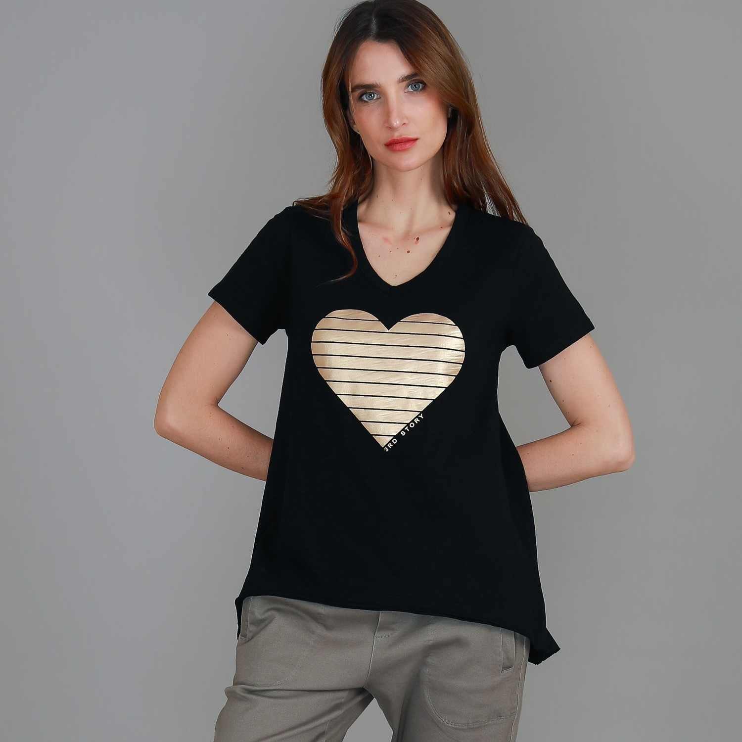 Upgrade your casual wardrobe with the Rue Gold Heart S/S Tee. Its soft cotton fabric provides comfort while the asymmetrical hem adds a touch of style. The gold heart detail elevates the look, making it a versatile piece for any occasion.