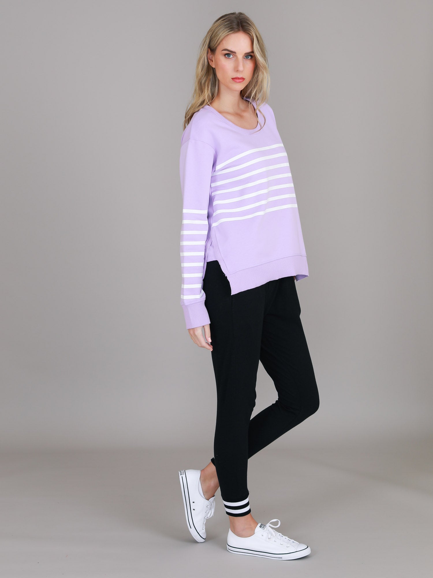 This cotton sweatshirt gives a laid back aesthetic perfect for that early walk. Featuring simple stripe print to the front and sleeves, the slouchy drop shoulder silhouette emphasize the relaxed nature of the piece.