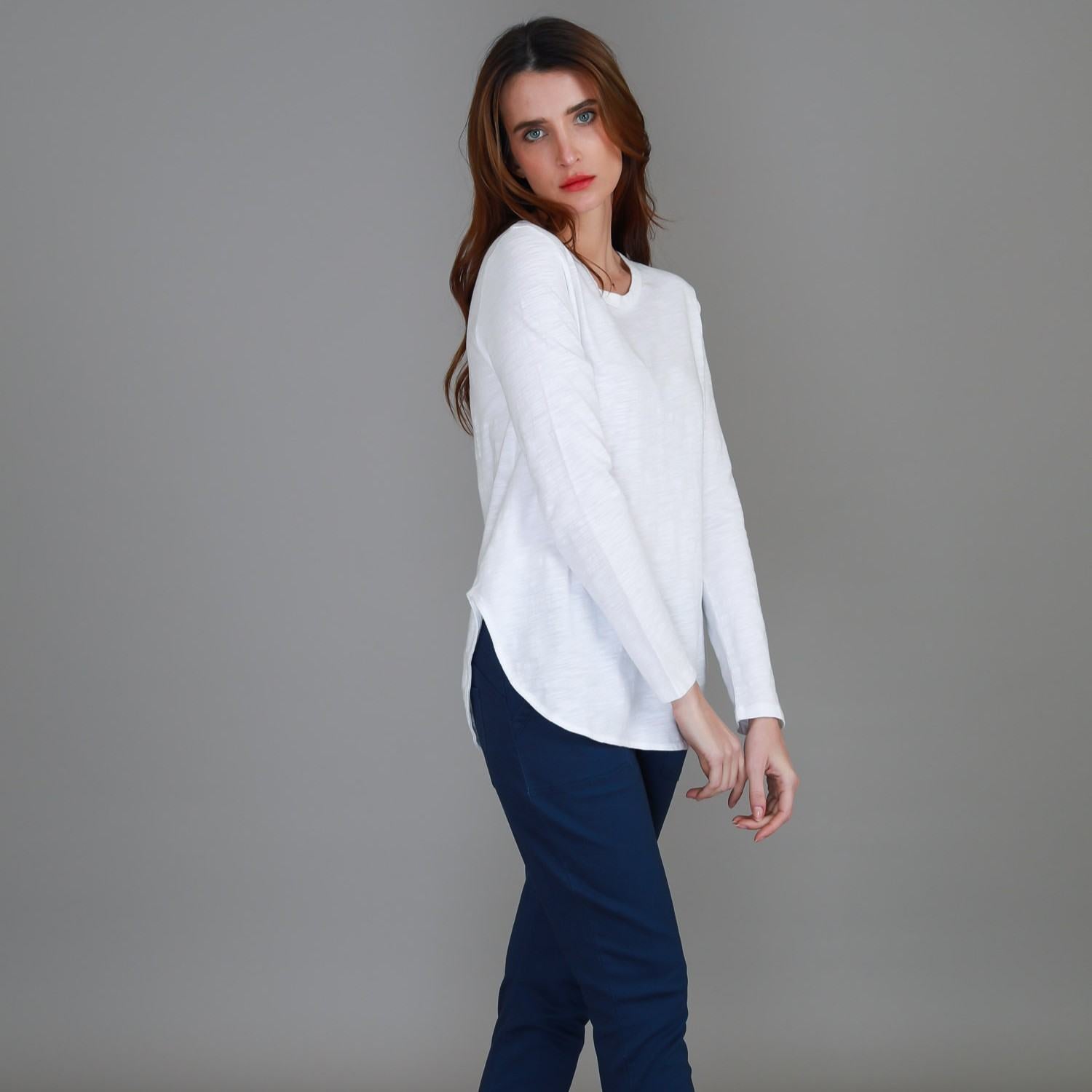 The Scarlett Tee is another great basic, designed for layering. The crew neck curved raw edge hem and long sleeves are a wardrobe essential. Great under sweaters when you need an extra layer or alone over joggers. Made from 100% cotton with a slub finish and an array of colours.