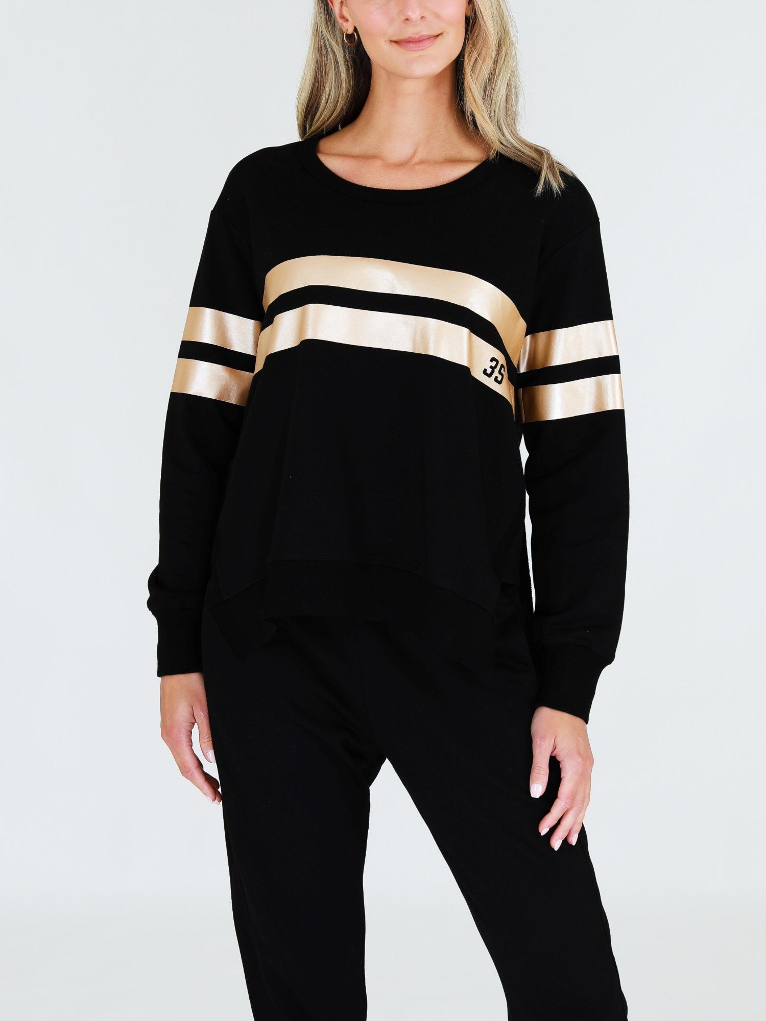 The Theresa Two-Stripe Graphic Sweatshirt is a bold essential for your casual wardrobe. Featuring luxe metallic gold stripes across the chest and sleeves, this black sweatshirt delivers a sporty yet elevated edge. Crafted from soft cotton-rich fabric, it’s designed for everyday comfort and effortless layering.