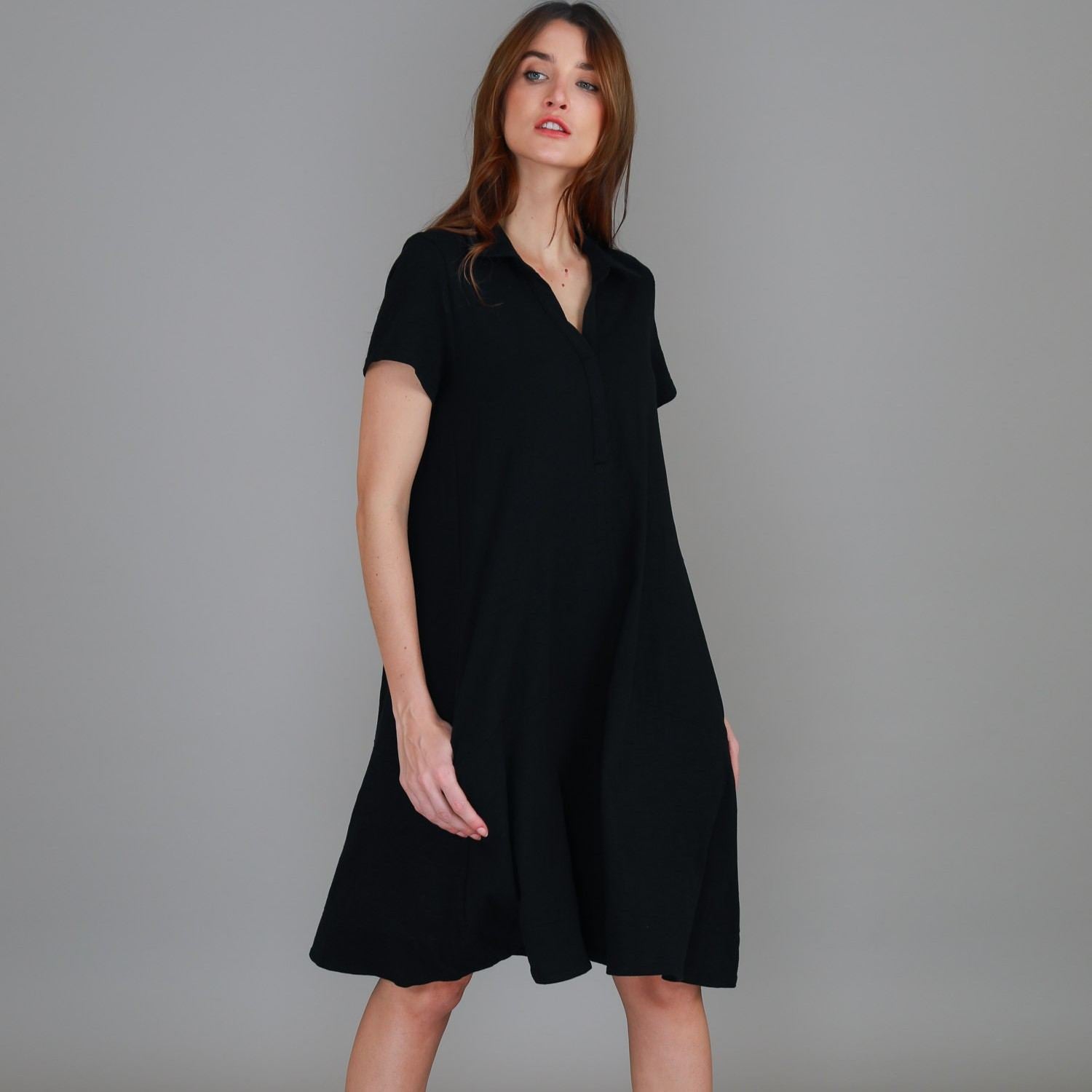 The Tibby Polo Short Sleeved Dress gives a modern update to the everyday t-shirt dress. Crafted from soft cotton jersey, it features a neat collar with a subtle V-neckline, short sleeves, and a relaxed fit that falls just above the knee. Functional side pockets add practicality without compromising style.