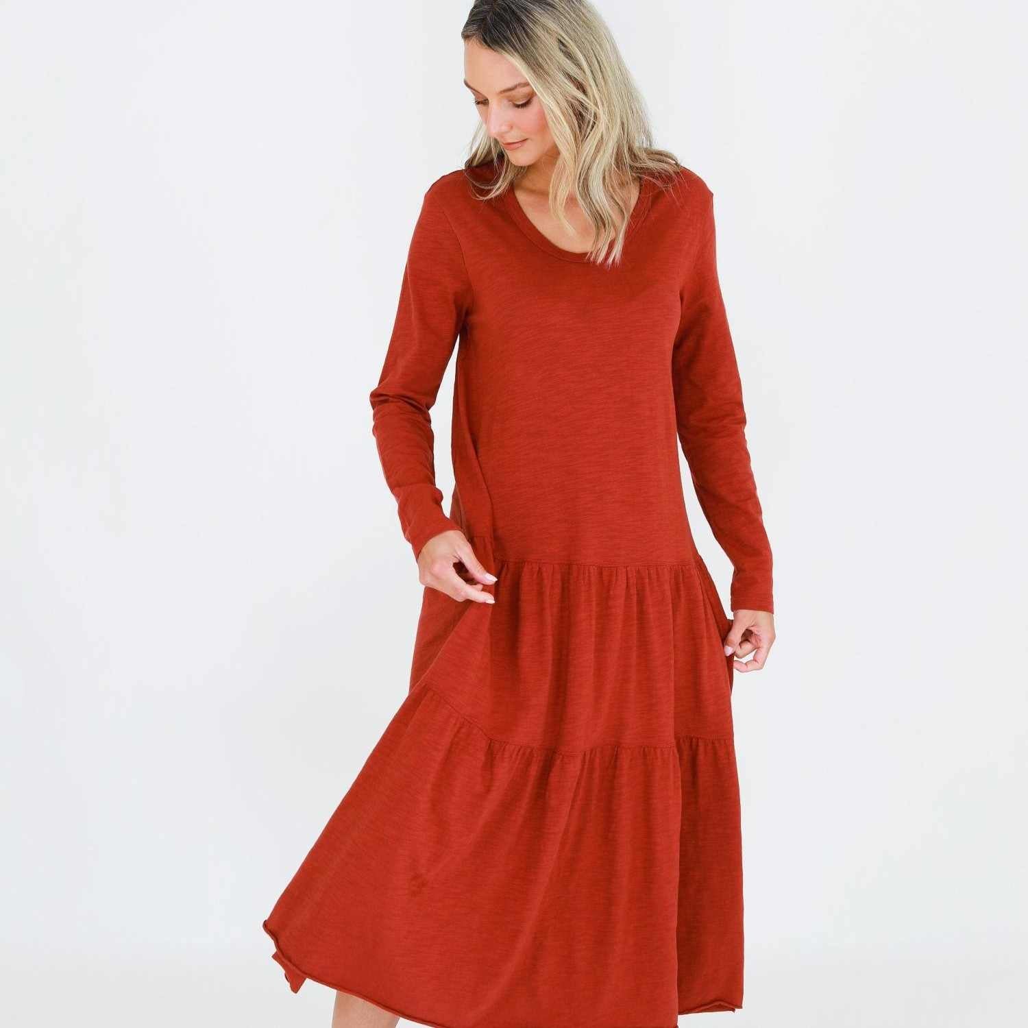 The Vera Tiered Midi Dress Limited features a scoop neck, long sleeves and a mid-length skirt with tiered tiers. Crafted from ultra-soft 100% cotton for superior comfort and quality, it is perfect for everything from work to weekend occasions.